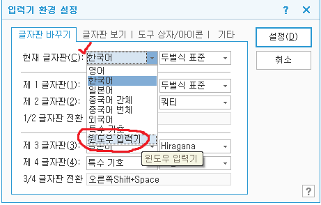 그리고 현재 글자판이 한국어로 되어있는 데, 윈도우 입력기로 바꿔주시면 됩니다.