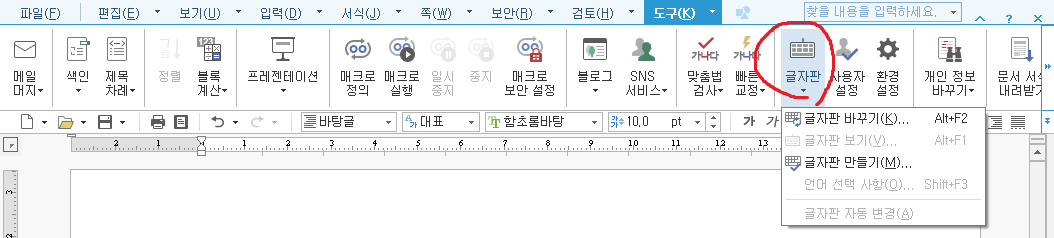 먼저 [도구]탭에서 [글자판]을 누르면 아래와 같이 [글자판 바꾸기] 옵션이 보입니다.