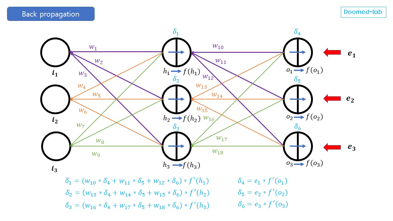 위의 이미지는 델타가 전파되는 것을 보여준다. 활성함수의 미분 값이 곱해져야 한다는 것에만 유의한 다면, 순방향 전파와 동일한 원리로 전파된다.