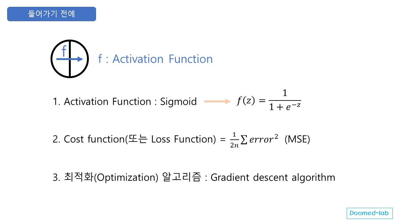 첫 째로는 활성함수(Activation Function) 인 데, 최근에는 ReLu 등 다른 활성함수를 많이 사용하는 추세지만, 여기서는 Sigmoid 함수를 가정한다. 시그모이드 함수의 장점 중의 하나는 미분이 간단하기 때문에 계산이 쉽다는 점이다.