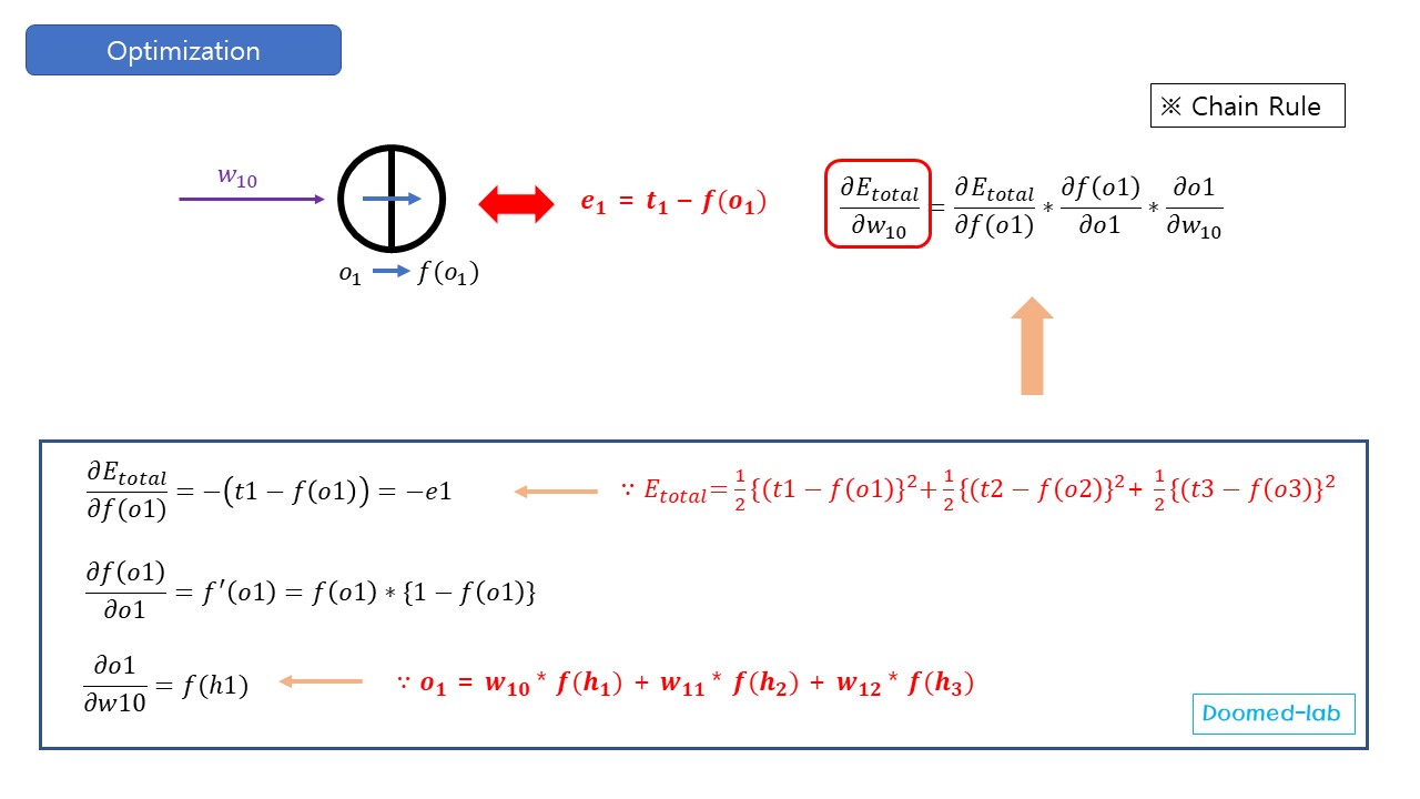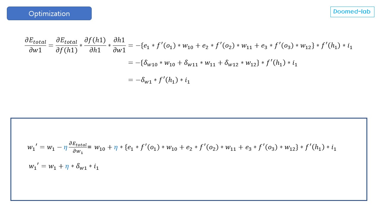 간단하게 하나의 은닉노드(h1)에 대해서 가중치의 갱신과정을 보여준다.