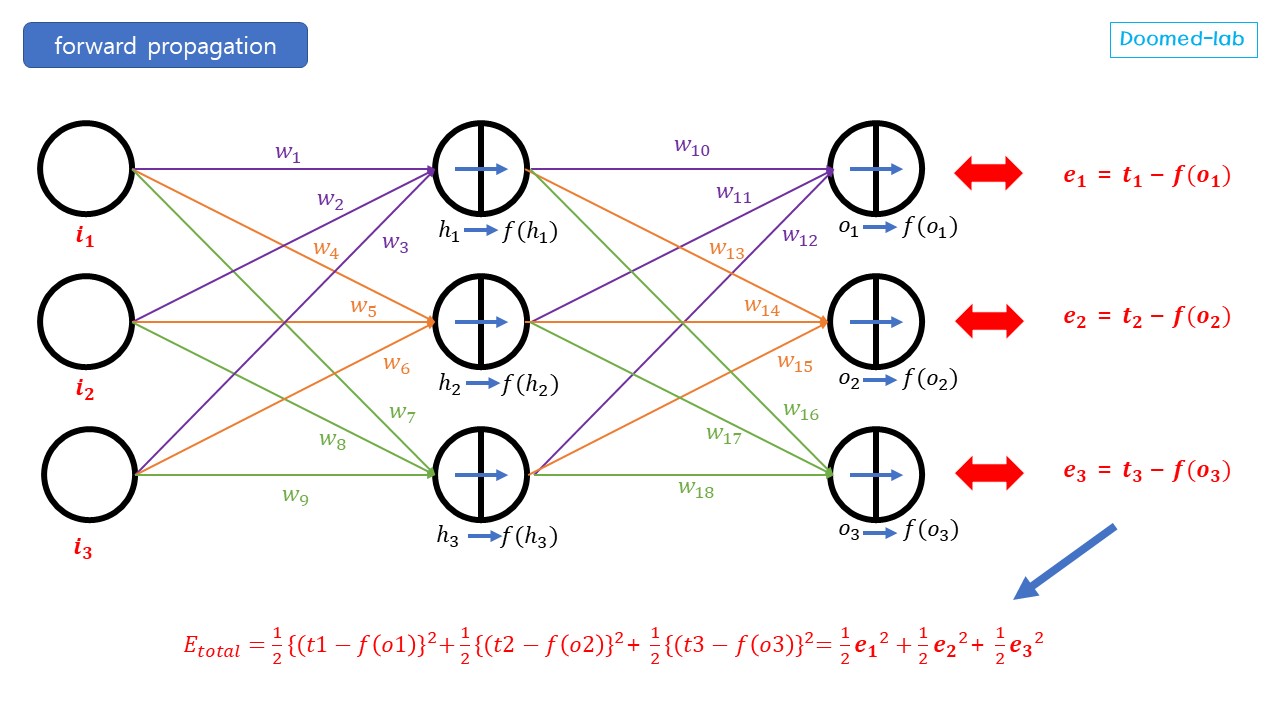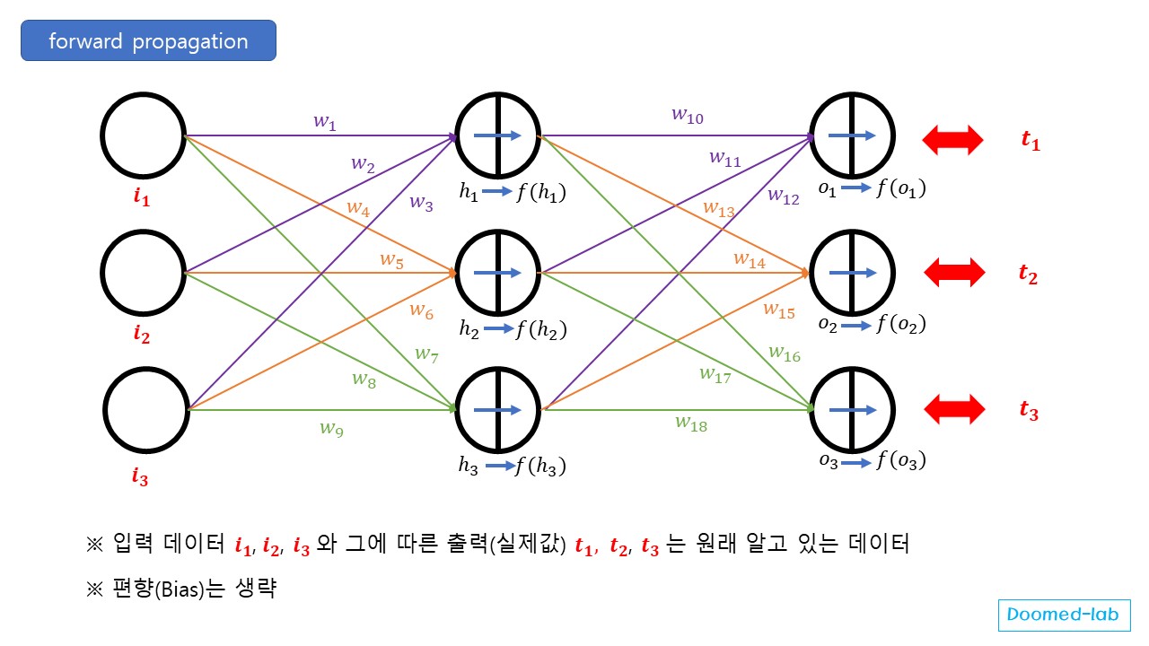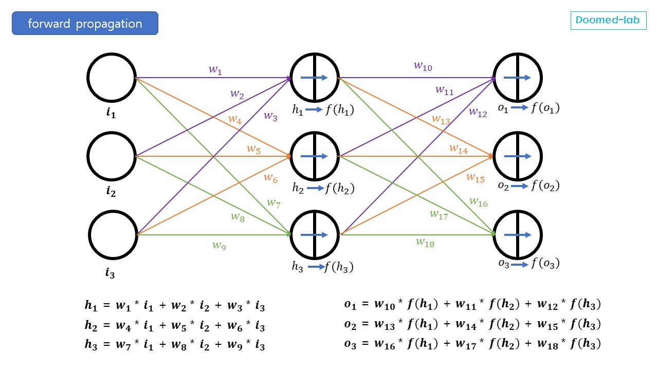 초기 가중치들을 이용하여 왼쪽 부터 오른쪽 순으로 계산하는 과정을 순방향 전파(Forward Propagation) 이라고 한다.