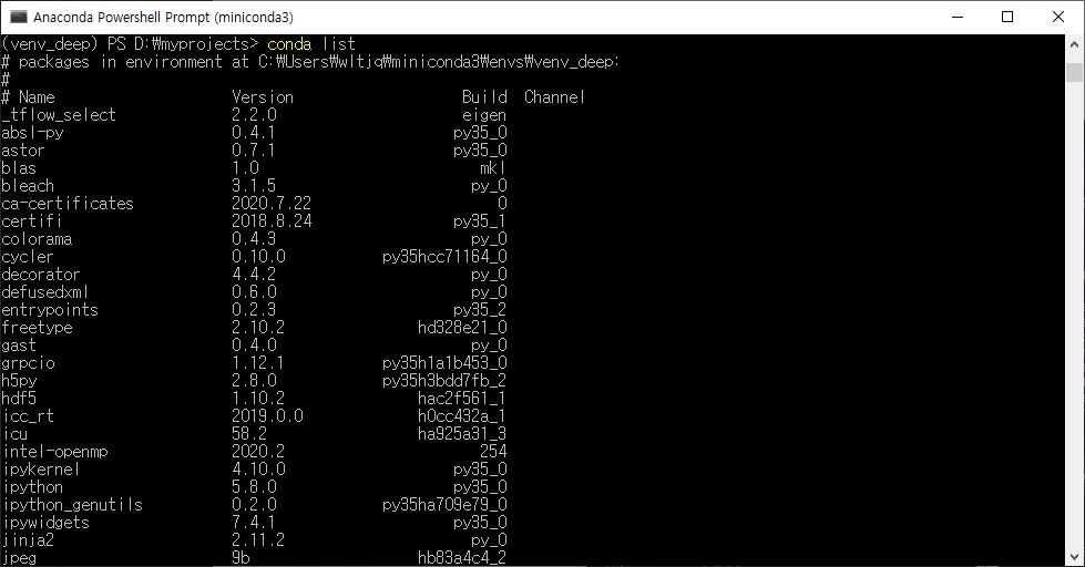 설치가 완료되면 conda list 명령어로 간단하게 라이브러리 목록과 버전을 확인할 수 있습니다.