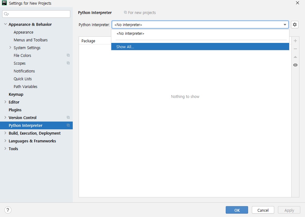 왼쪽의 Python Interpreter 탭을 선택하면 아무것도 없습니다. 오른쪽 상단의 화살표를 클릭한 후 Show All.. 을 선택합니다.