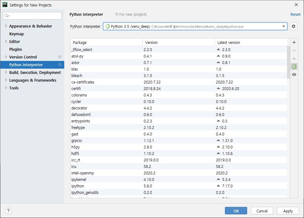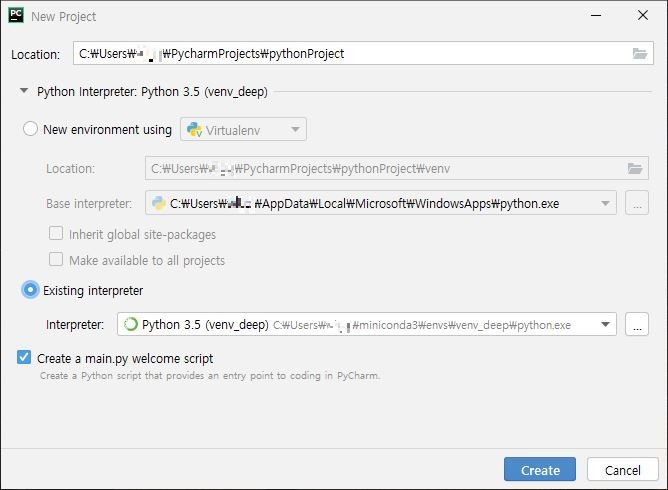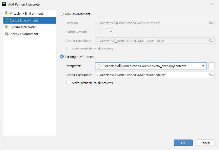 Existing interpreter 에서 가상환경을 선택할 수 있습니다.