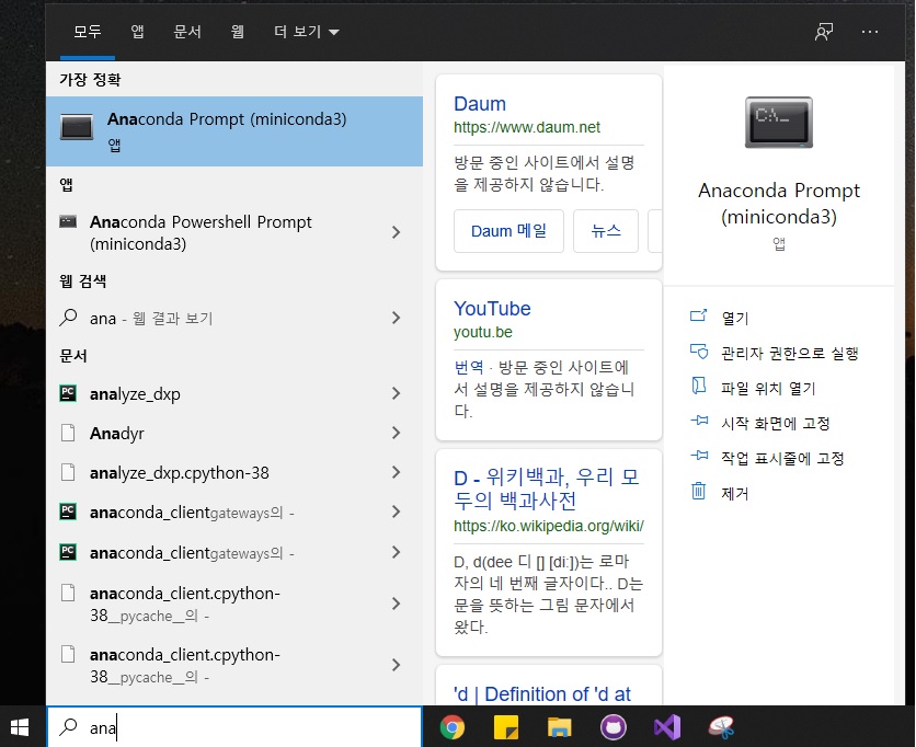 Anaconda 프롬프트를 실행해주시면 되는데, 윈10의 경우 간단하게 검색으로 앱을 쉽게 찾을 수 있습니다.