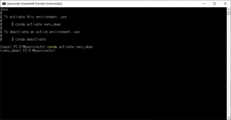 정상적으로 실행될 경우 좌측에 (가상환경명)으로 표시됩니다.