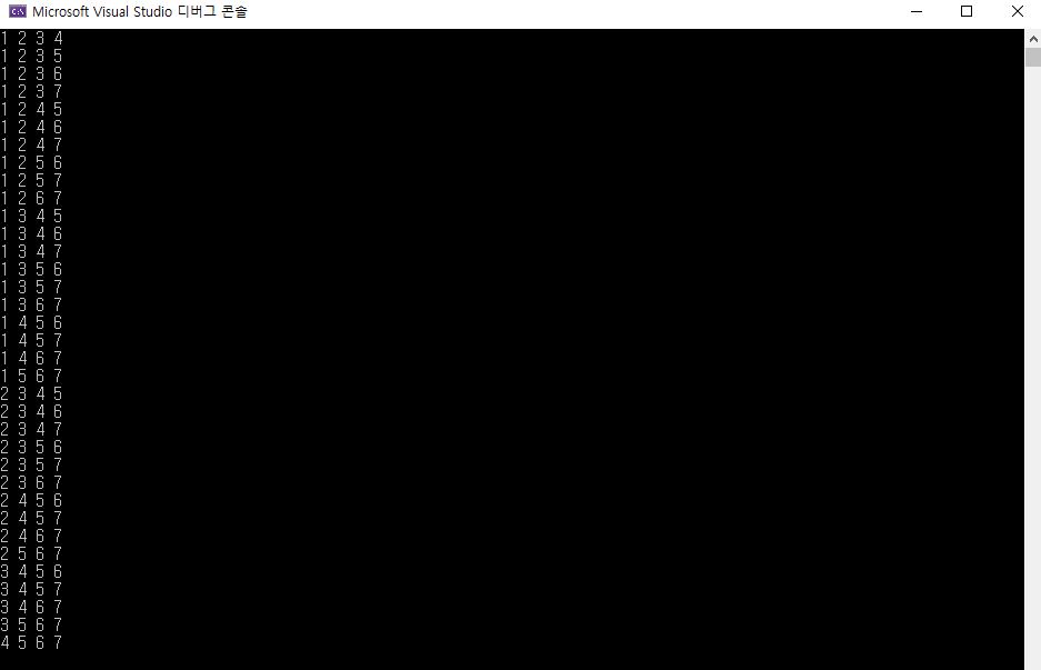 아래는 n = 7 , r = 4 라고 가정하고 7C4의 경우를 모두 출력하는 코드이다.