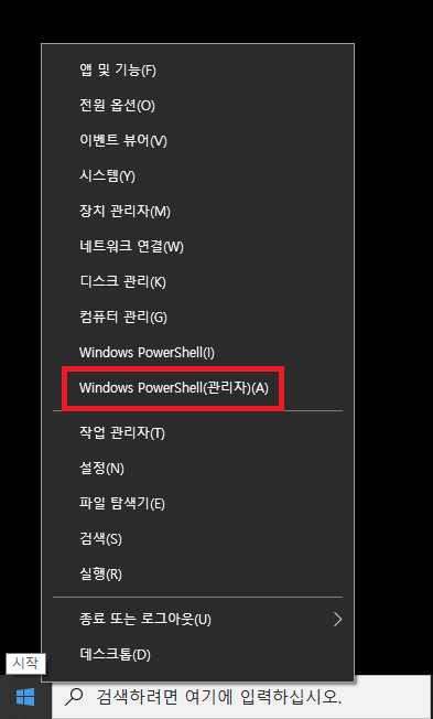 왼쪽 아래 시작 아이콘을 우클릭 -> Windows PowerShell(관리자) 클릭