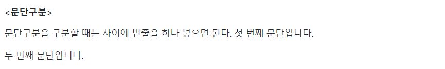 문단구분을 구분할 때는 사이에 빈줄을 하나 넣으면 된다. 첫 번째 문단입니다.