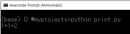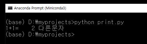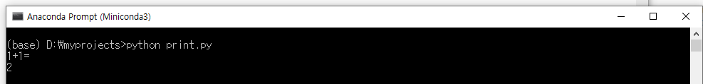 위와 같이 1+1 = 2 가 아니라 자동으로 첫번째 print 명령이후에 줄이 바뀐 것을 확인할 수 있습니다.
