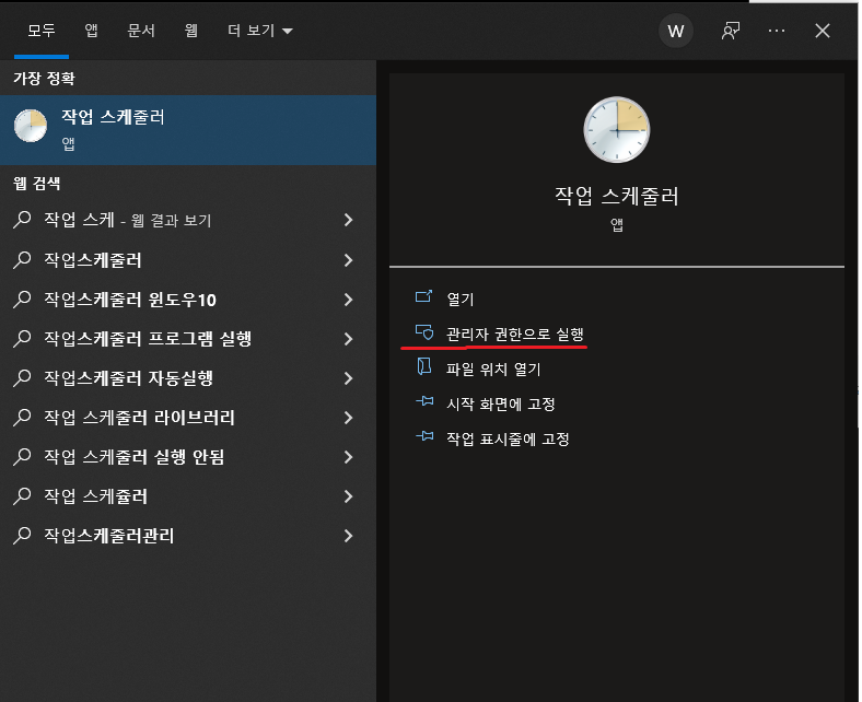 작업 스케쥴러를 우클릭 한 뒤에 관리자 권한으로 실행해줍니다.