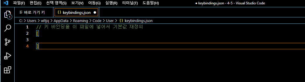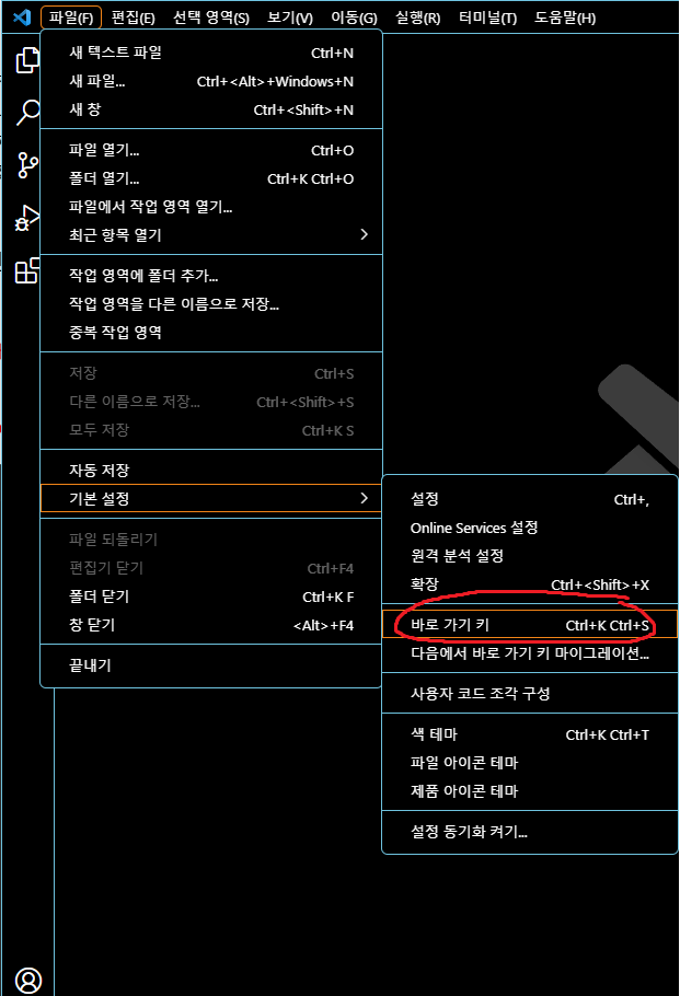 1. 먼저 파일 -> 기본설정 -> 바로가기 키를 누릅니다.