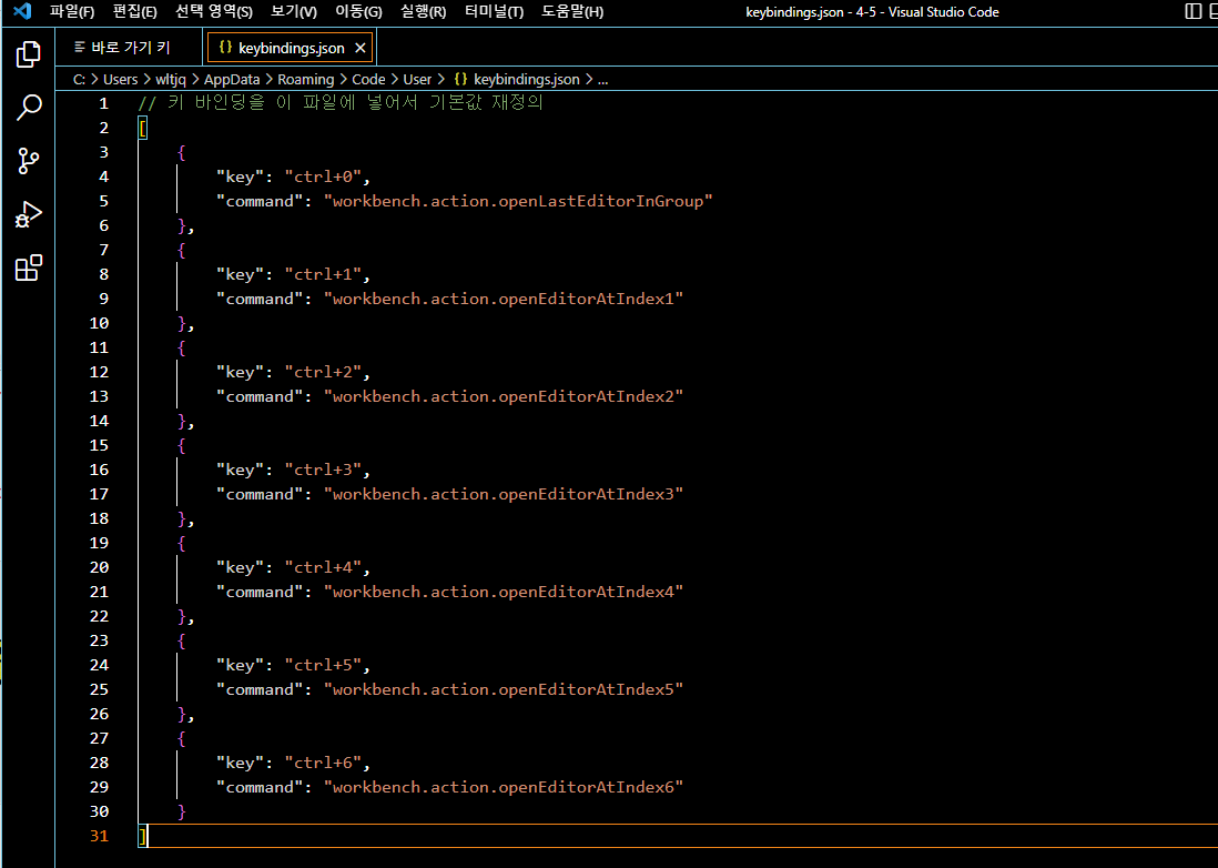 VS code에서는 탭 이동 명령을 단축키로 지정할 수 있습니다.